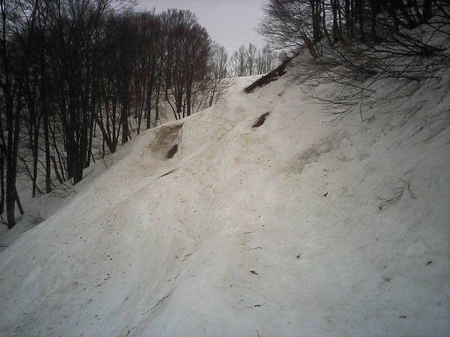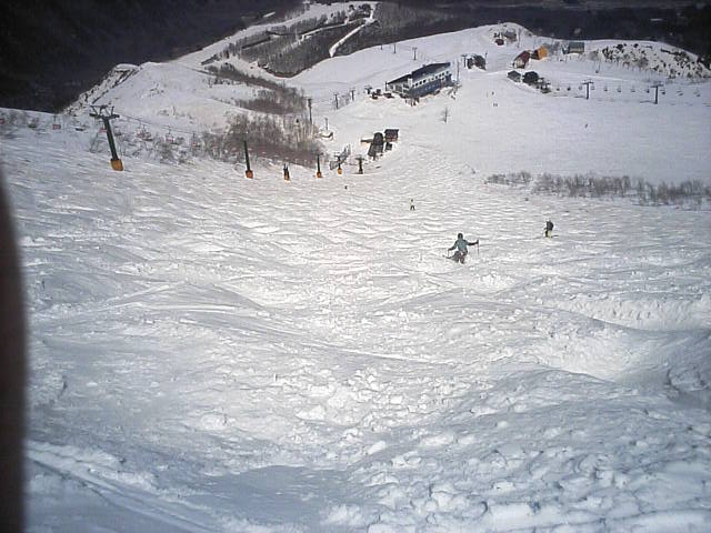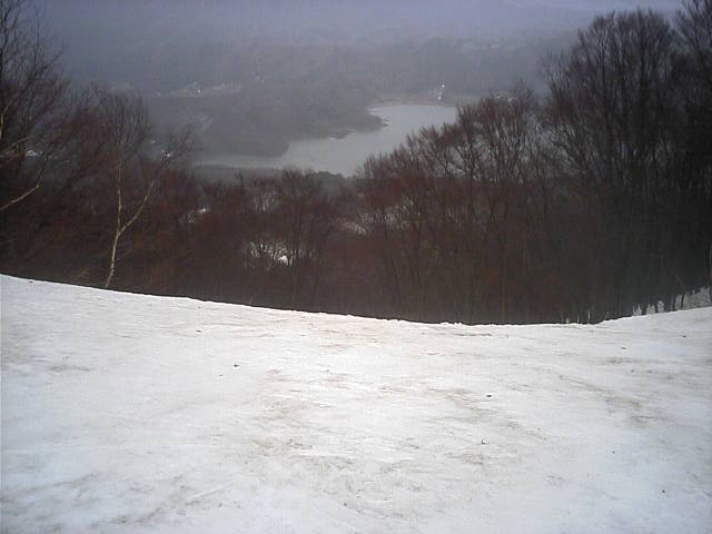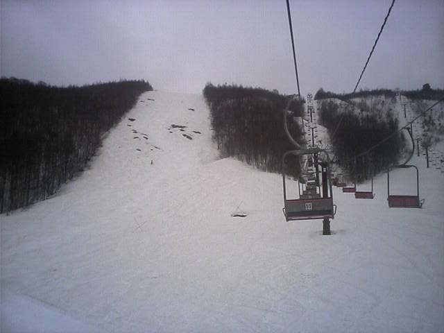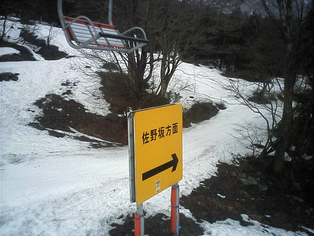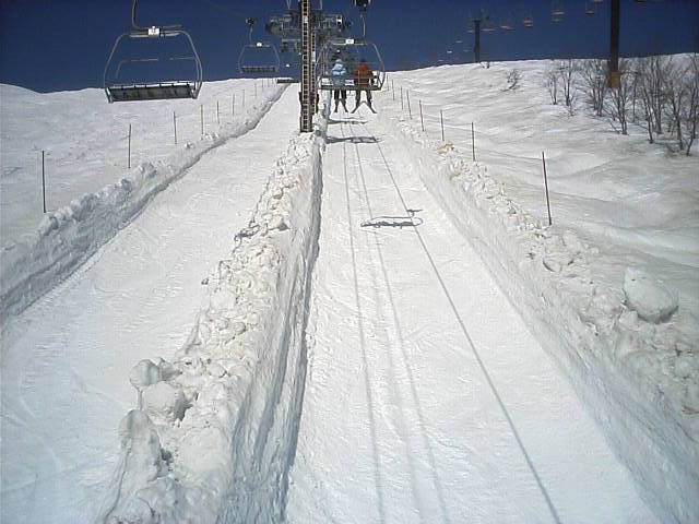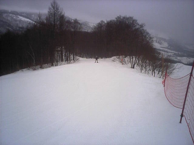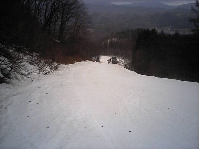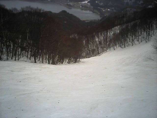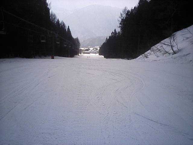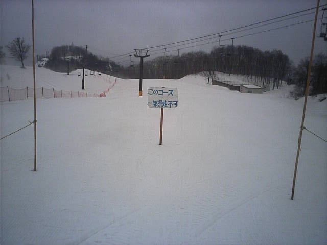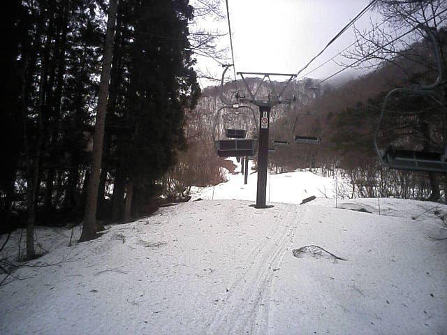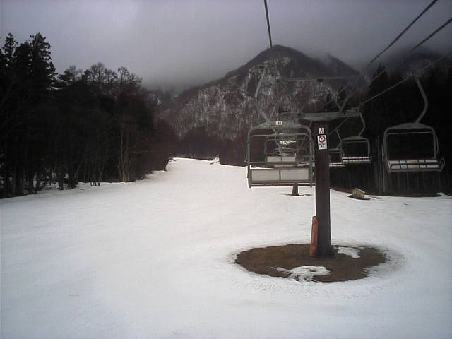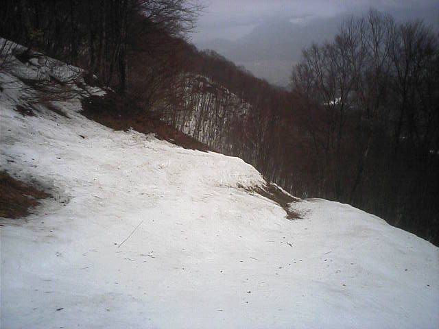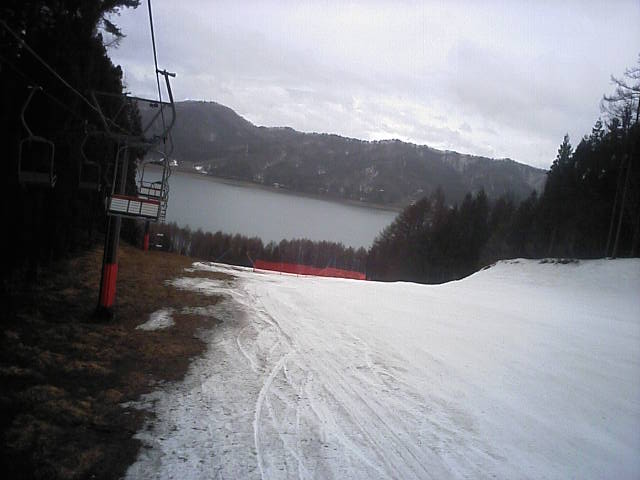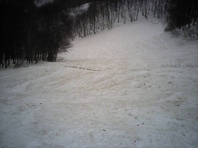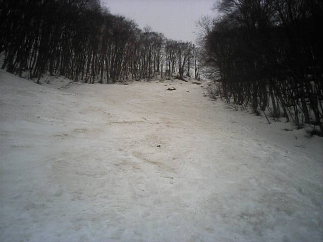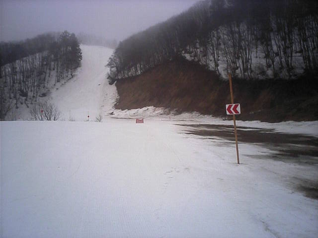 11:36~第5ペア1本で滑れるコース。上部は相当薄くなっていて、慎重な コース取りが必要だった。尚第1トリプルへの連絡通路は1箇所完 全に分断。板を脱いで渡ったorz