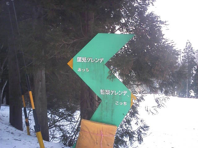 左:珍しい駅舎。2ラインの高速ペアが同じ建物から出ています。 中:若栗林間コース。こんな緩斜面に高速ペアが掛かっています。 右:珍しいデザインの案内板。