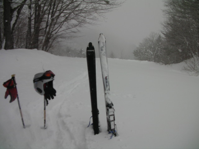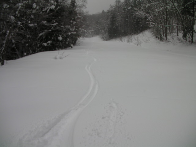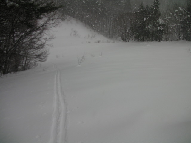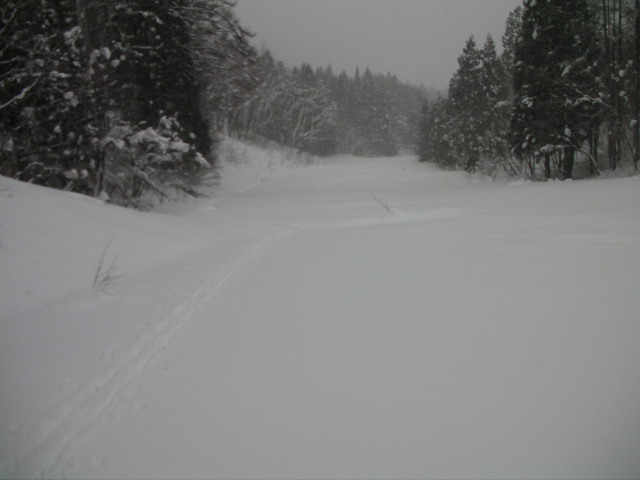 YANABA snow&greenparkの現状のゲレンデに直角方向にあった廃ゲレンデです。ヤナバビレッジというペンション地区側から、アルペントレッカーとシールを使って登ってみました。 積雪は推定100cm+ほどあったと思います。上部は表面2~3cmがクラストしていて最中雪でしたが、下部の斜度の無い所はフカフカでした。