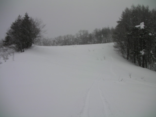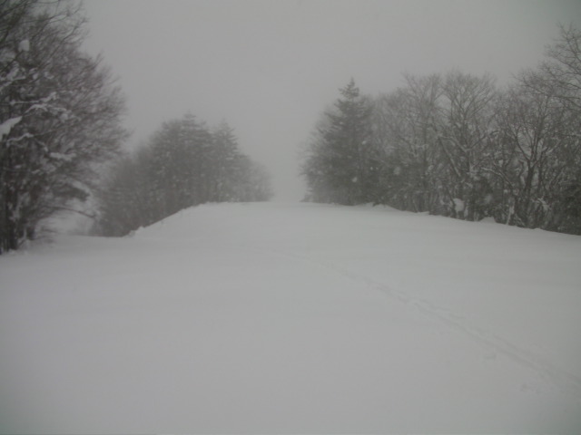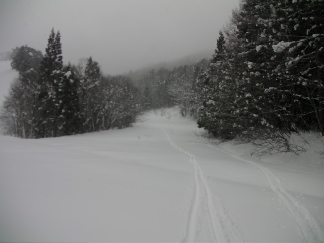 12:26~恐怖の第3ペアを使って滑るコースとは呼べないようなコース。本来は鹿島槍からの連絡コースとなっている。3本中2本は既に閉 鎖。この第2だけが生きていた。尚、さのさかへの連絡林道は通常に機能している模様だった。