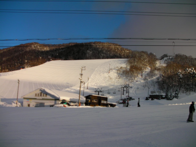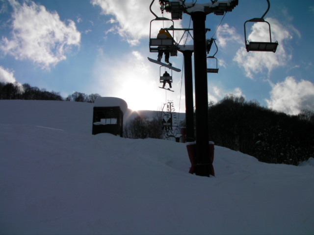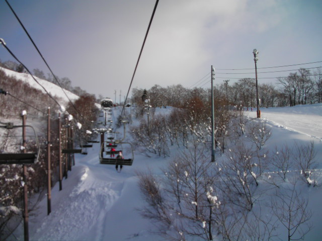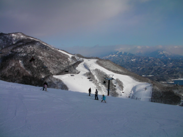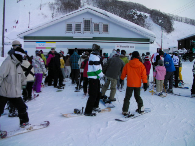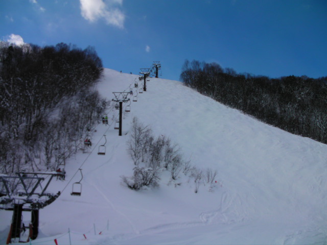 第7ペアが専用に掛っている丸山ゲレンデです。右下がりの片斜面で長さも無く私は余り好きではありませんが、何故か結構なリフト待ちがありました。ゲレンデも人が多かったです。