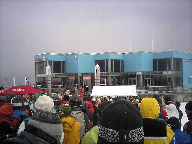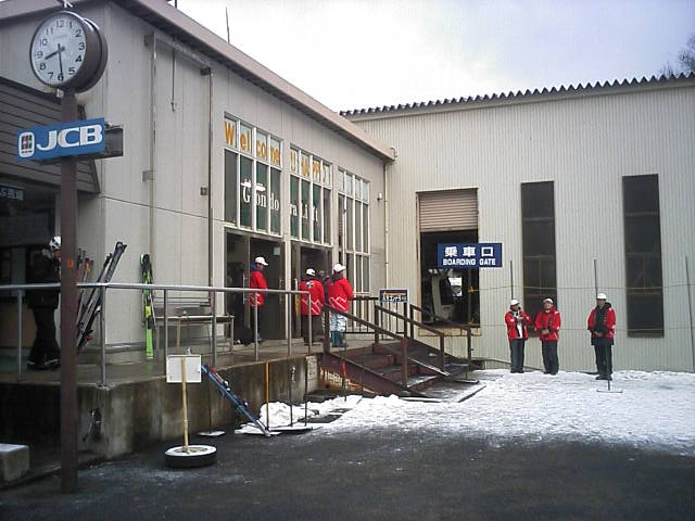 リフト券購入&交換を終えこれから乗車ですが、待ちの列は駅舎内だけで外には溢れていませんでした。赤いはっぴは本日のイベント『白馬八方尾根スキー場50年オープニングセレモニー』のスタッフの皆さん。