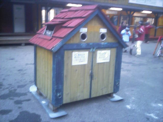 ゴンドラ駅舎前に置かれた山岳案内所。何の変哲も無い建物ですが、基礎部分に注目すると、、、、、ソリ(笑)
