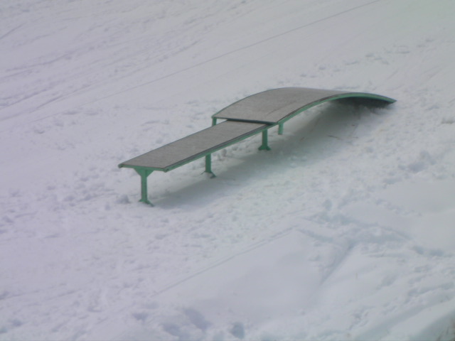 暫く行かなかったらアイテムが増えていました。上からBOX→ウェーブ→フラットダウンBOX→キッカー→レインボーBOX(アイテム名は適当)です。滑走方向右端では巨大キッカーを作成中でした。